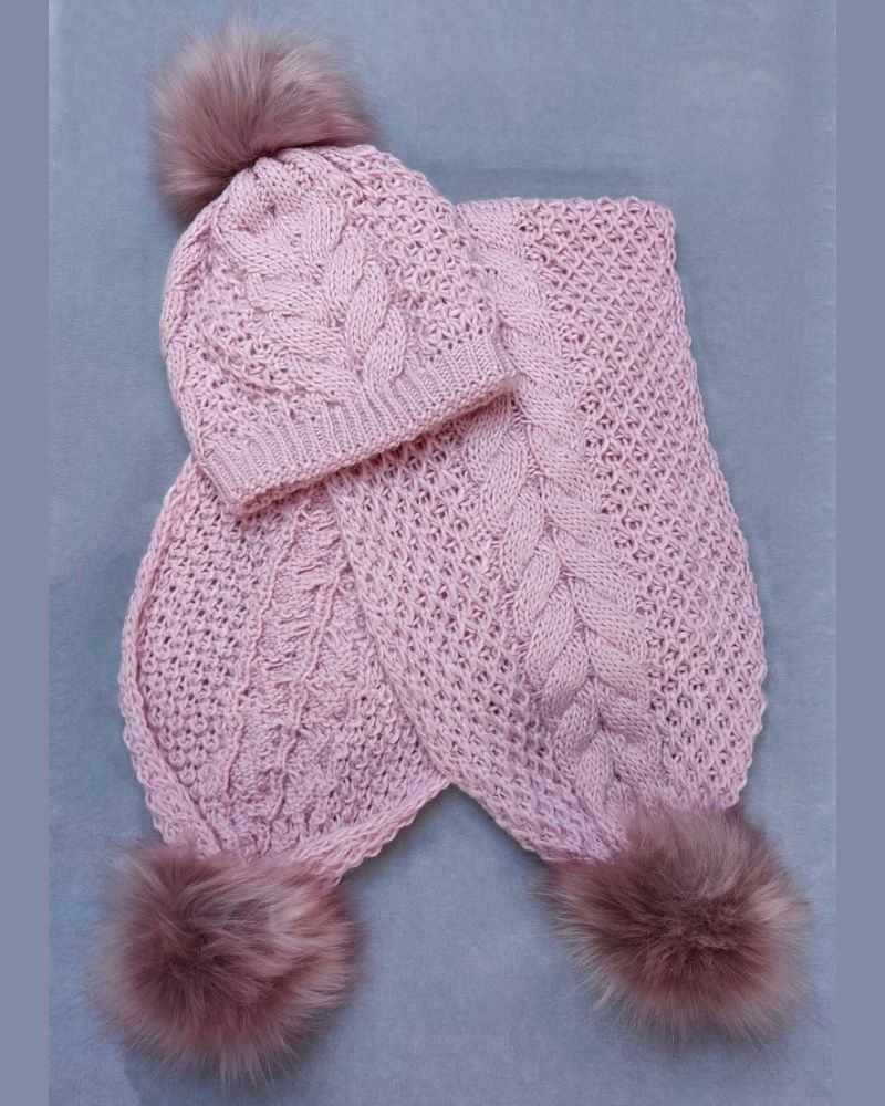 Komplet damski- szal z pomponami- róż