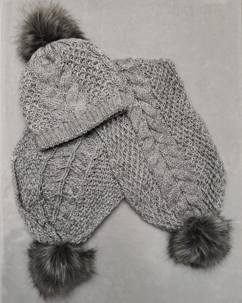 Komplet damski- szal z pomponami- szary